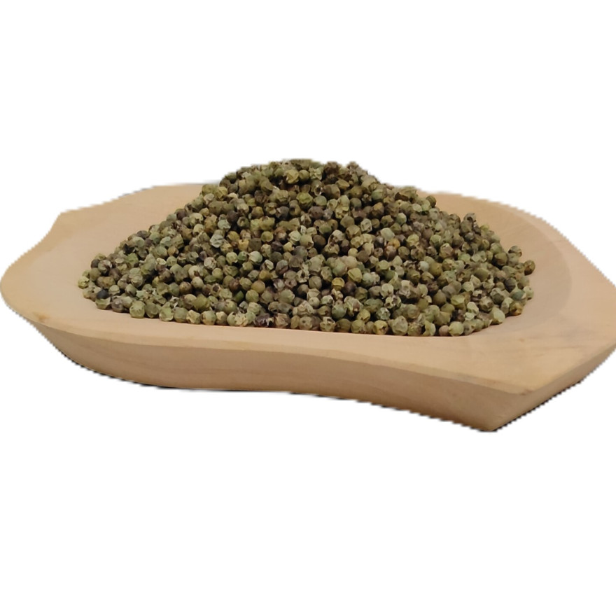 Pieprz zielony to niedojrzałe owoce pieprzu czarnego, które są suszone lub konserwowane, aby zachować swój świeży, łagodny smak i zielony kolor. W wersji suszonej (ziarno) wyróżnia się delikatnością i subtelną ostrością – znacznie łagodniejszą niż pieprz czarny. Ma lekko ziołowy, świeży aromat, który doskonale uzupełnia wiele dań.